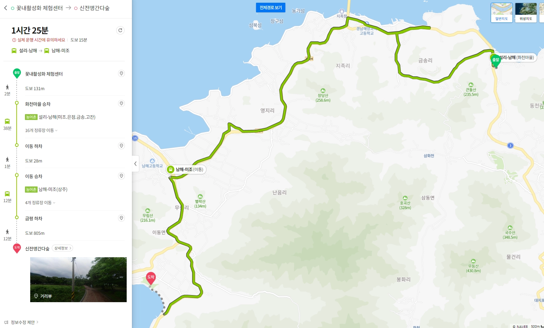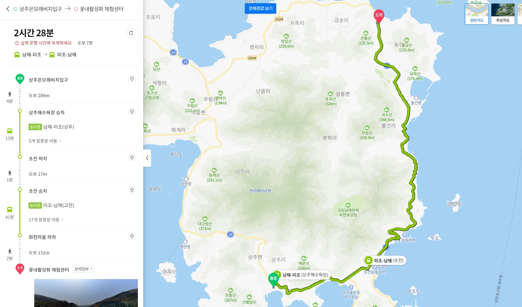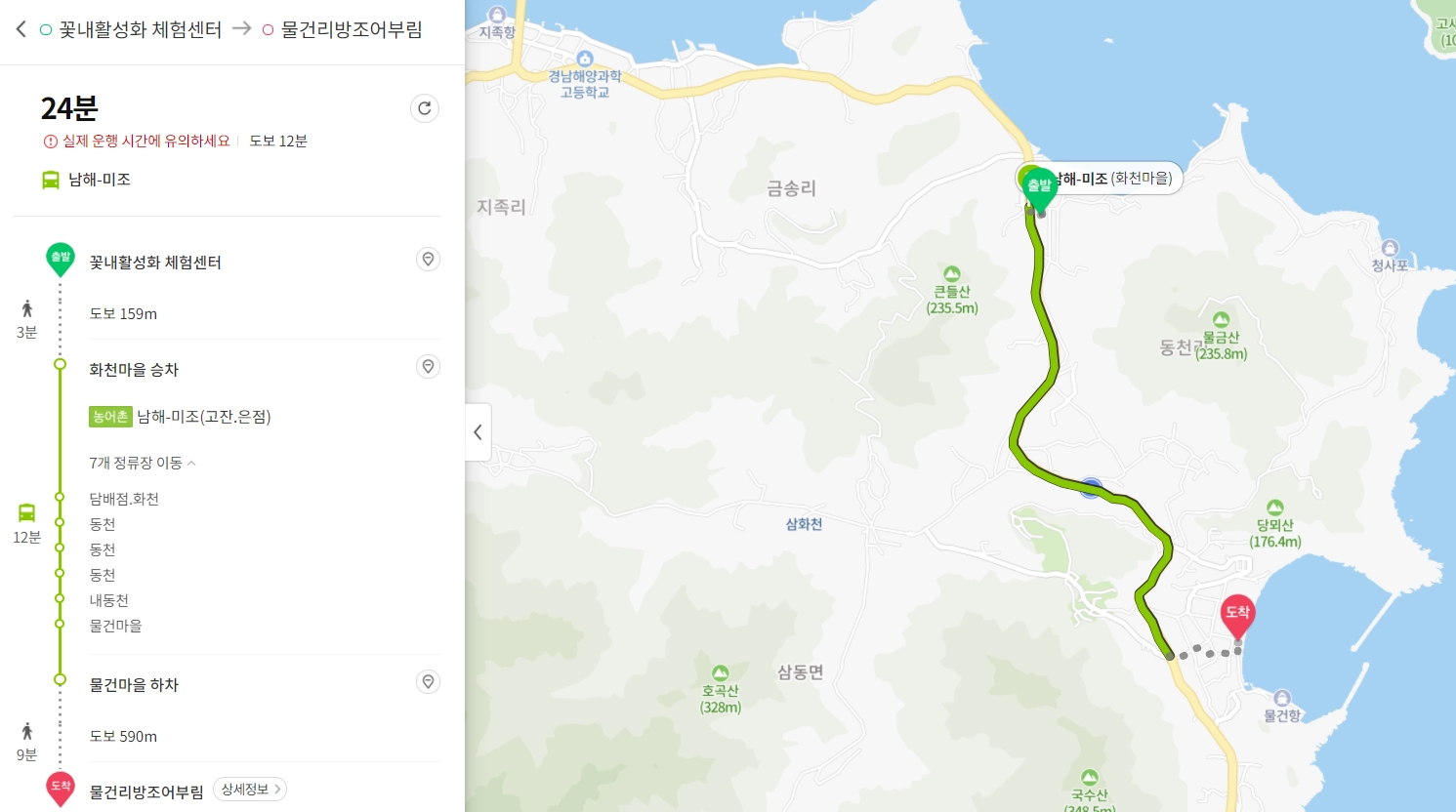 꽃내활성화체험센터→화천마을 승차(농어촌) 설리-남해(미조.은점.금송.고잔)→이동 하차→길 건너 정류장→이동 승차→(농어촌) 남해-미조(상주)→금평 하차→도보→신전앵강다숲