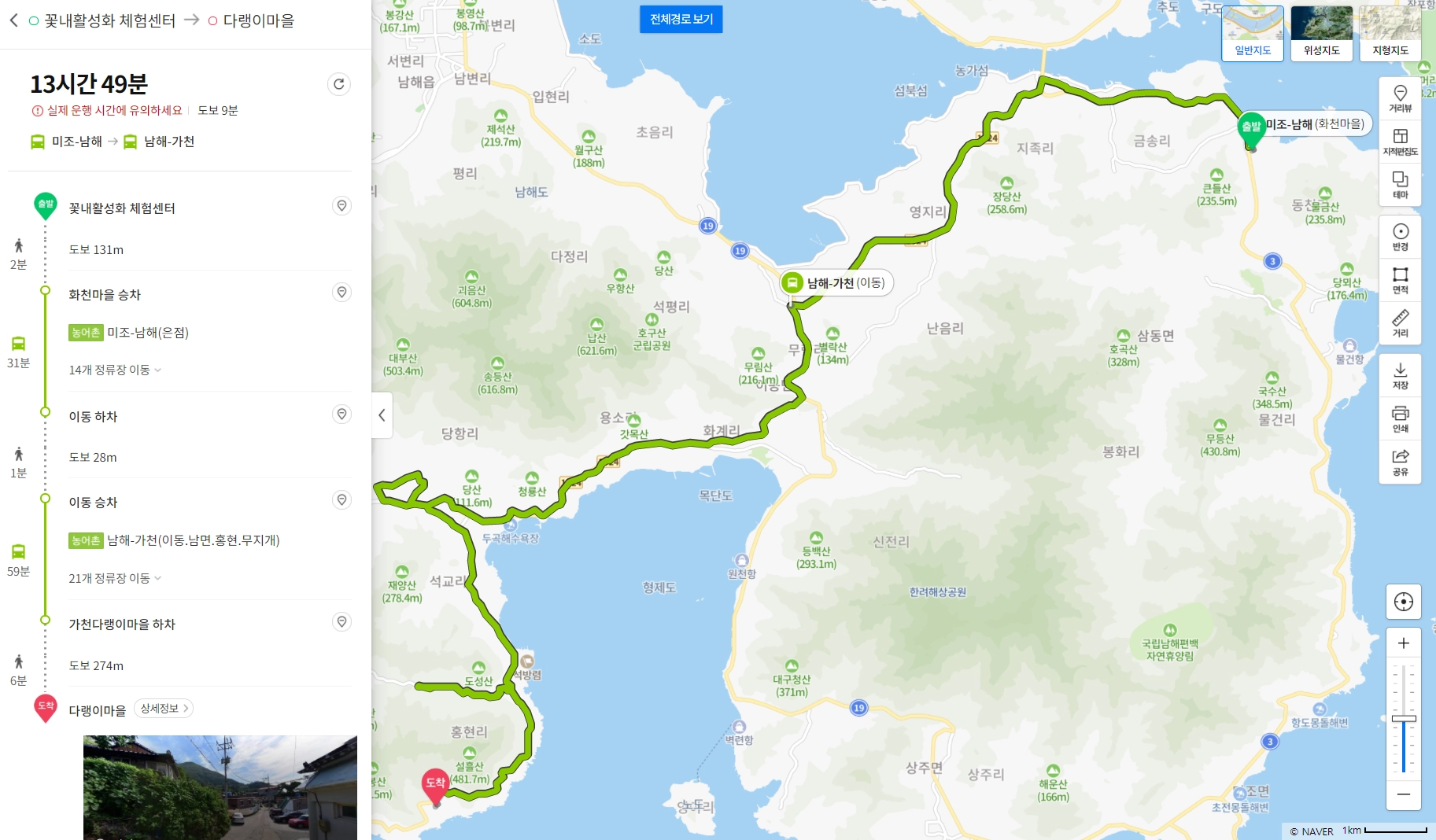 꽃내활성화체험센터→화천마을 승차(농어촌) 미조-남해(은점)→이동 하차→길 건너 정류장→이동 승차(농어촌) 남해-가천(이동.남면.홍현.무지개)→가천다랭이마을 하차