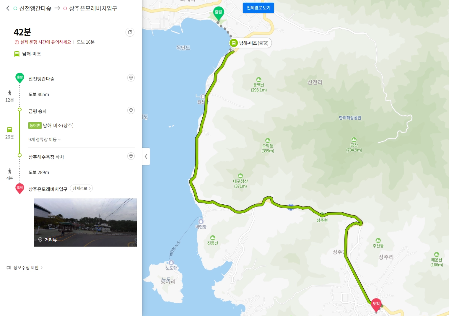 신전앵강다숲→금평 승차(농어촌)남해-미조(상주)→상주해수욕장 하차