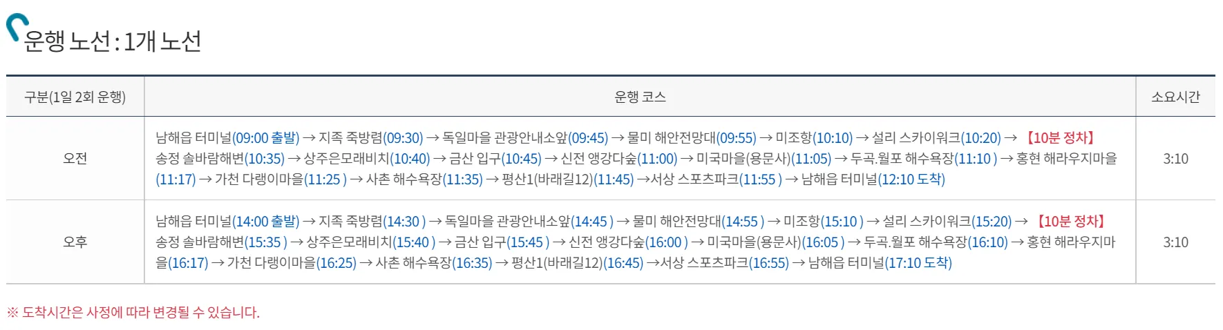 신전앵강다숲→금평 승차(농어촌)남해-미조(상주)→상주해수욕장 하차