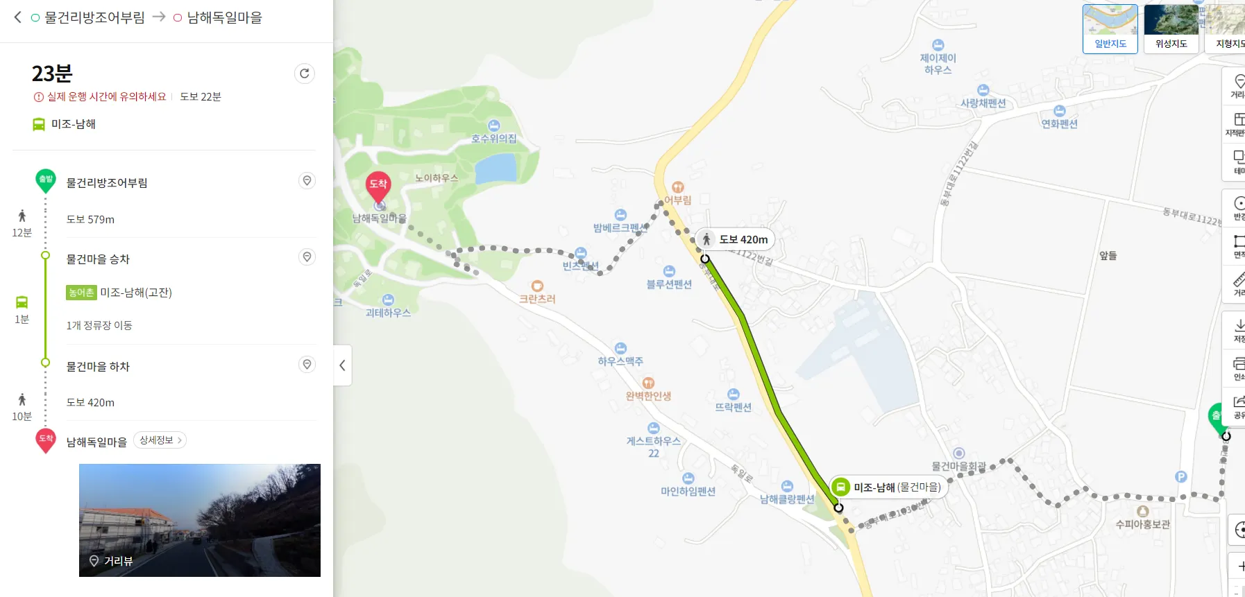 꽃내활성화체험센터→화천마을 승차(농어촌) 미조-남해(은점)→이동 하차→길 건너 정류장→이동 승차(농어촌) 남해-가천(이동.남면.홍현.무지개)→가천다랭이마을 하차