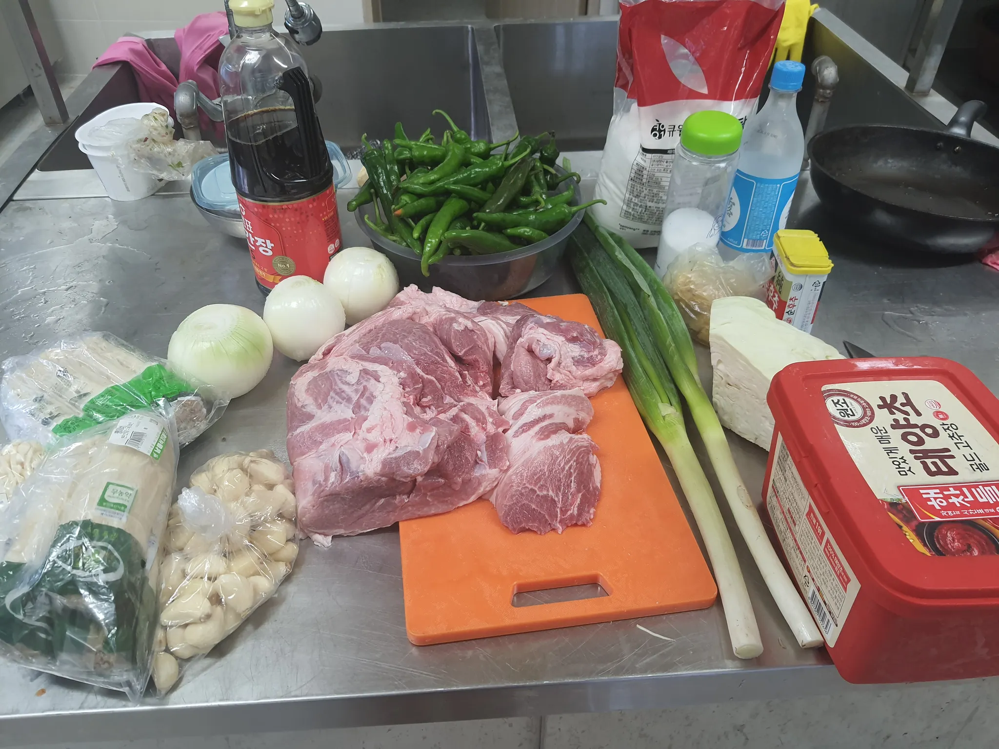 돼지고기 앞다리살 2.5kg, 양파 3개, 대파 2뿌리, 양배추(중간 사이즈)1/4, 다진 마늘 4스푼, 일반 고추 5개, 청량 고추 8개