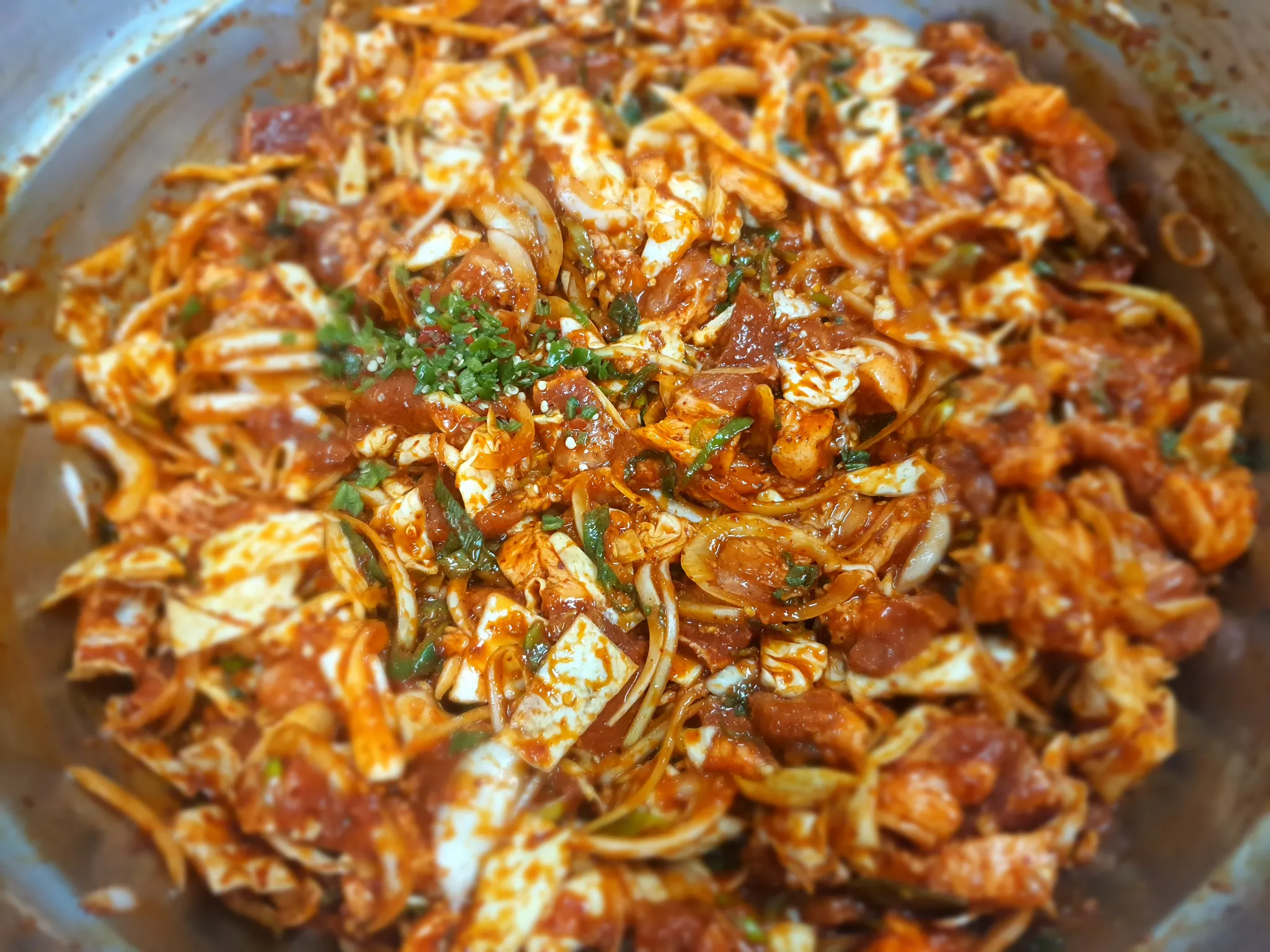 돼지고기와 양파, 대파, 양배추, 고추, 청량고추, 설탕, 소주, 후춧가루, 간장, 고추장을 넣어 섞는다