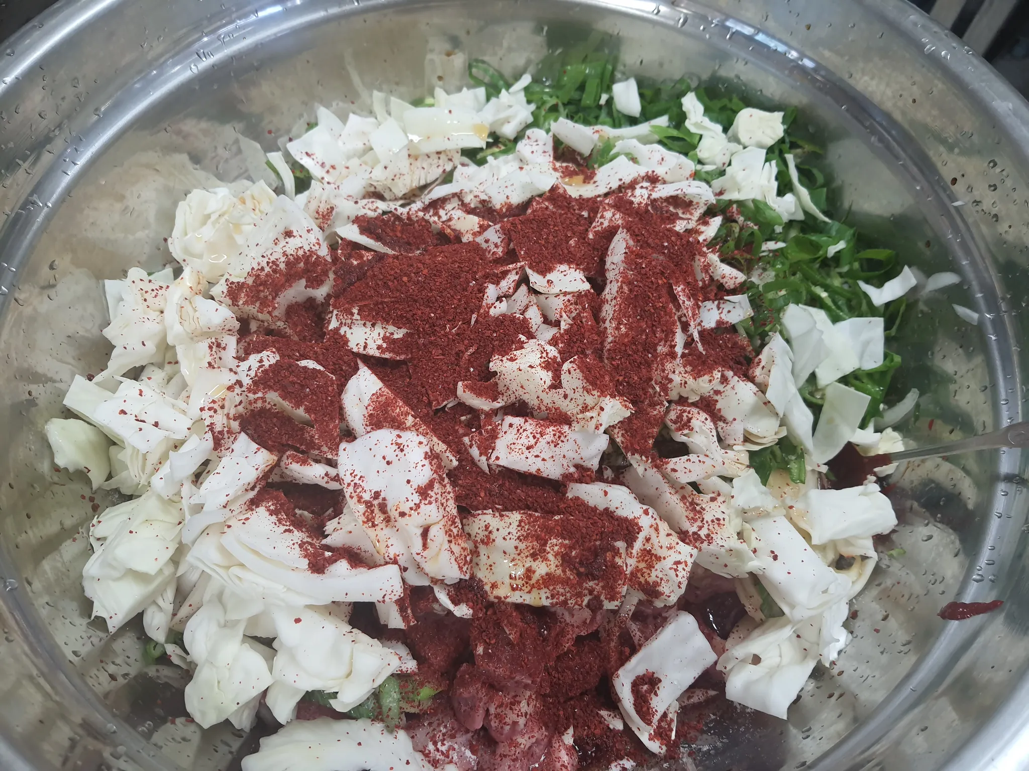 설탕 2국자, 소주 2국자, 맛소금, 후춧가루 2스푼, 간장 3국자, 고추장 1국자, 고춧가루 2국자